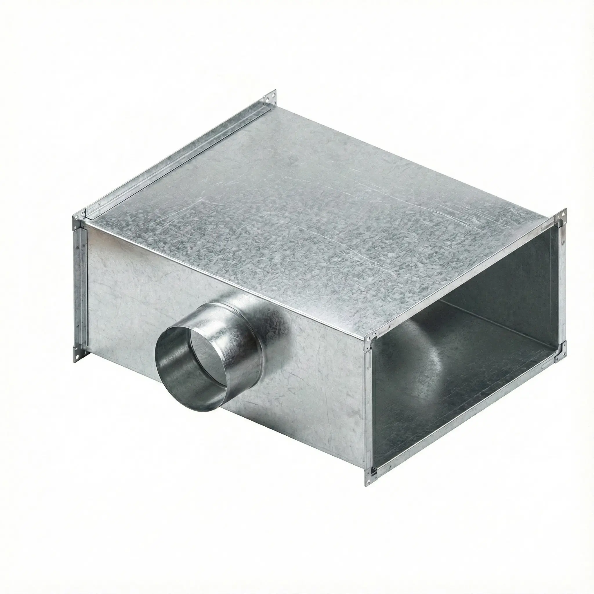 Тройник прямоугольного сечения с круглой врезкой предназначен для подключения круглого воздуховода к основной прямоугольной магистрали вентиляционной системы. Изделие применяется в общеобменной вентиляции и кондиционировании при необходимости объединения каналов различного типа сечения.